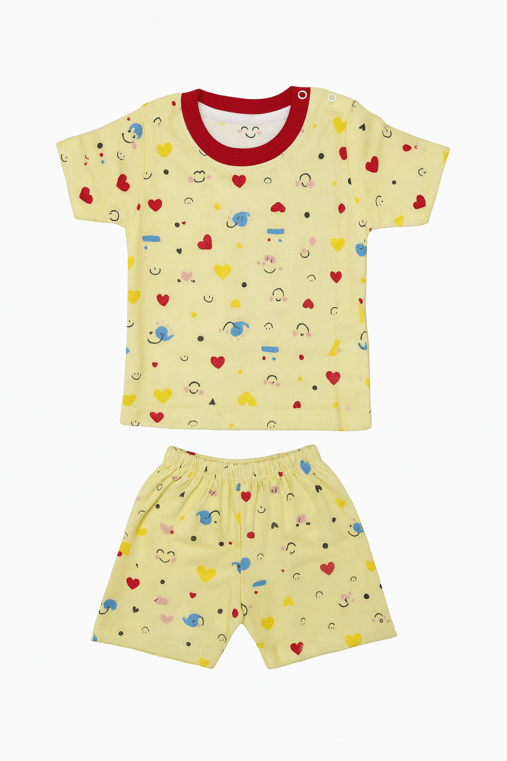 The T-shirt features a round neckline with snap button closure for easy dressing, paired with elastic shorts for flexibility and movement. The yellow fabric with colorful smiley faces, hearts, and playful prints makes it a fun and vibrant outfit. Suitable for both boys and girls, this unisex set is lightweight, durable, and easy to wash — perfect for everyday wear, sleepwear, or playdates.