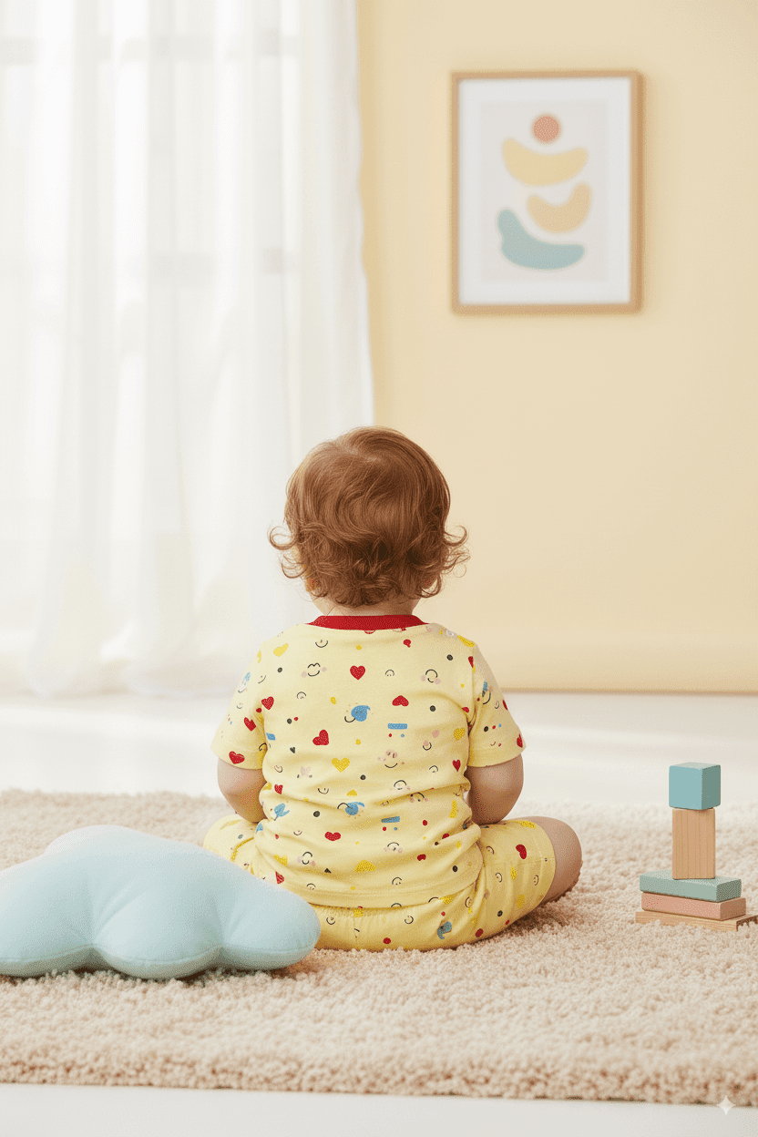 Adorable baby in a yellow romper with colorful cartoon prints, styled with a plush cloud pillow and wooden stacking blocks in a cozy nursery