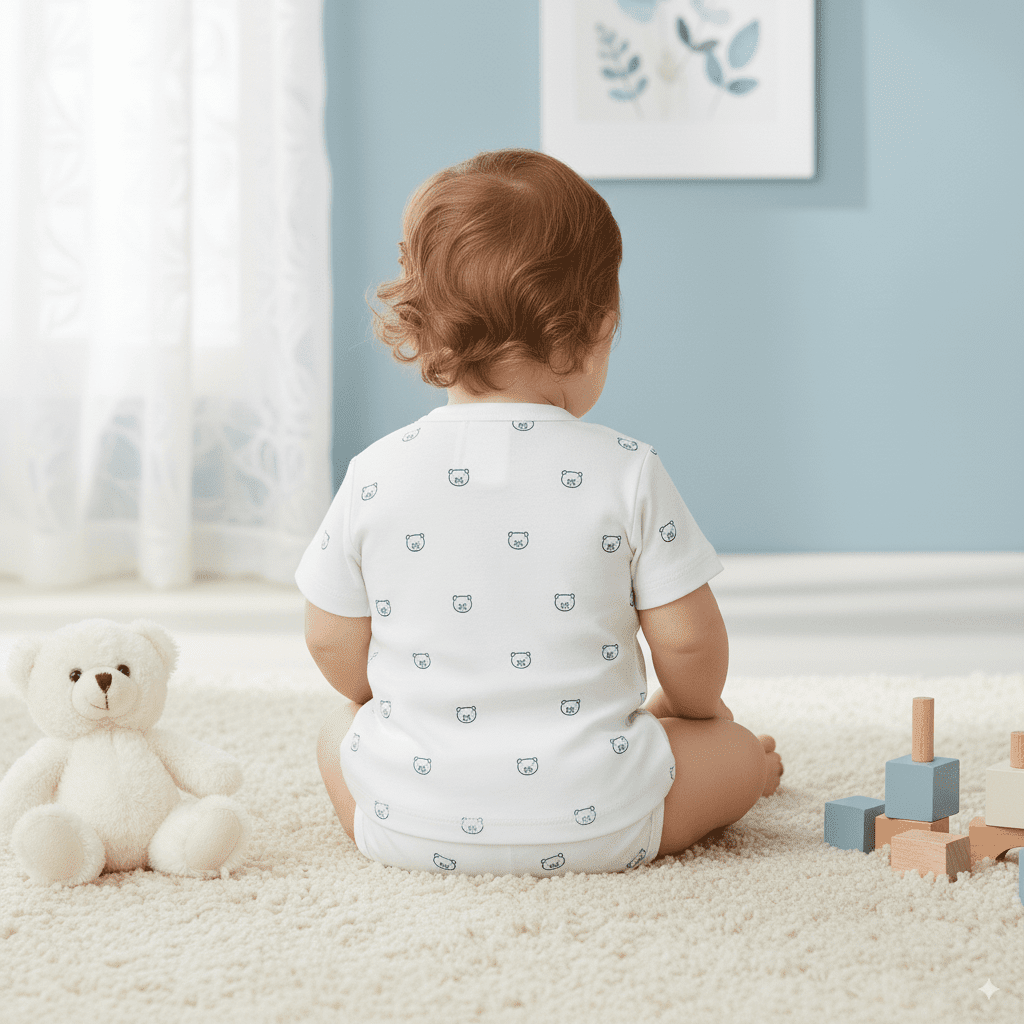Adorable baby wearing a soft white bear print bodysuit, styled with plush teddy and wooden toys for a cozy indoor look.
