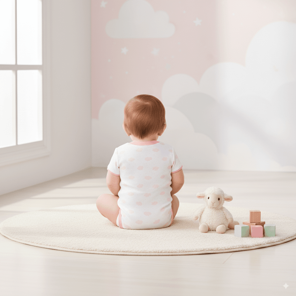 Baby in a white onesie with pink trim and soft cloud print sitting on a round rug with a plush lamb and pastel wooden blocks in a pink cloud-themed nursery