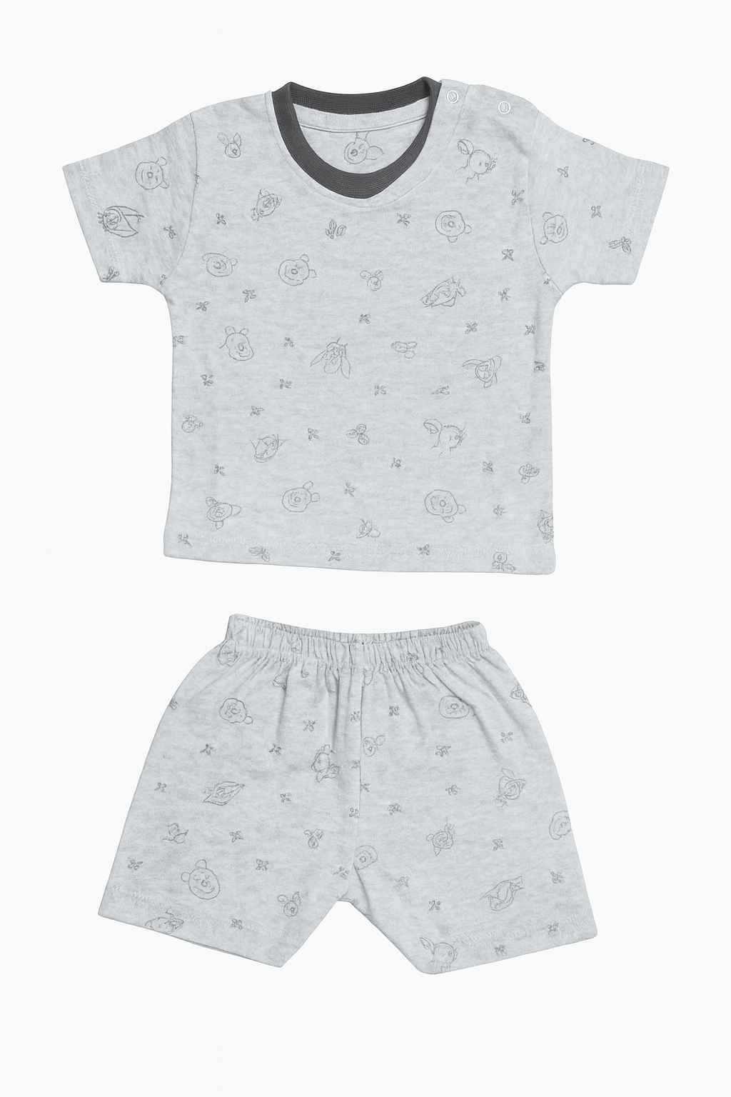Baby Cotton Round Neck Short Sleeve Set – Grey Doodle Print | T-Shirt & Shorts (6–12 Months)