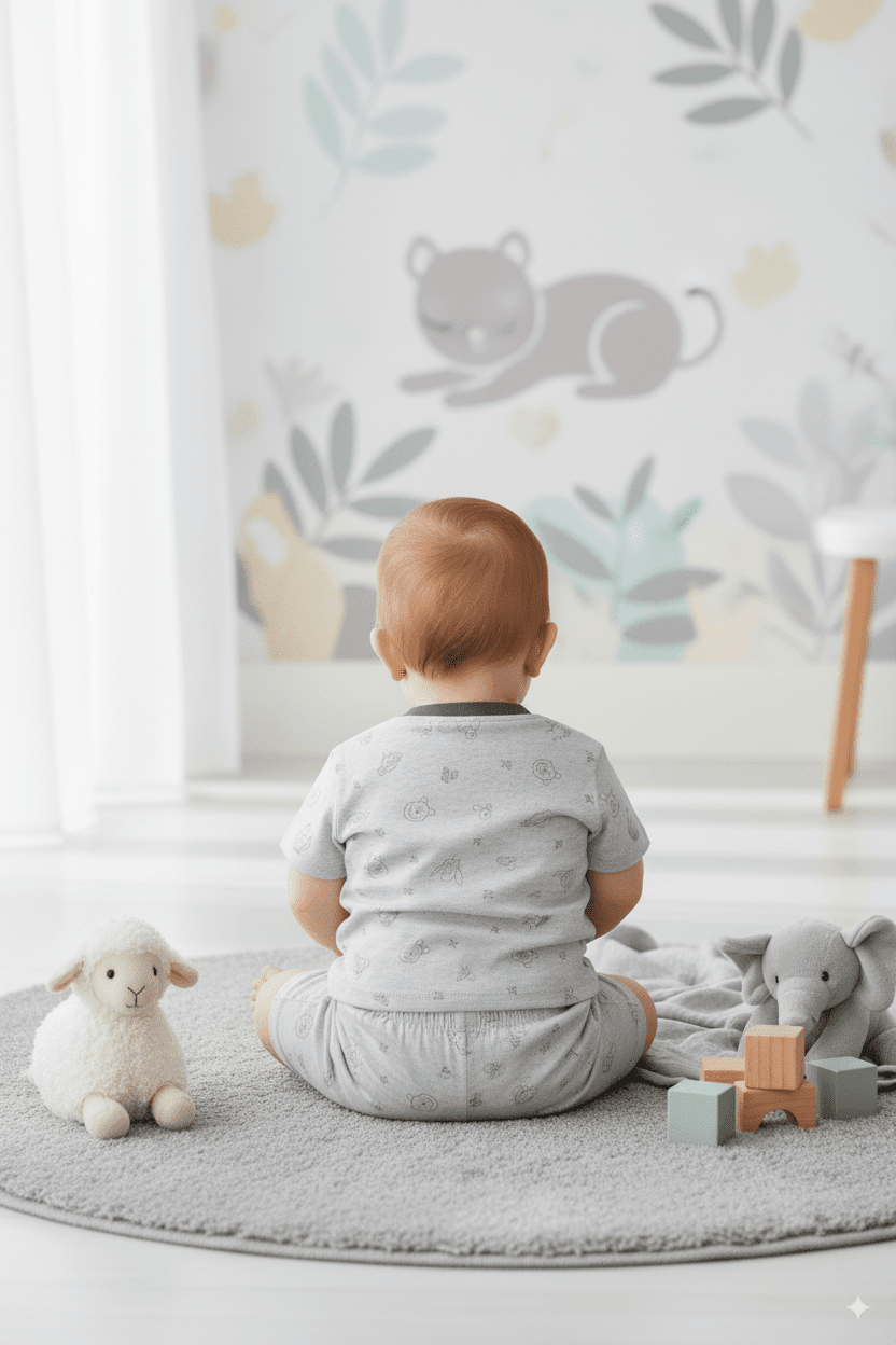 Smiling baby in a light grey animal print romper sitting on a soft rug with plush toys and wooden blocks in a nursery