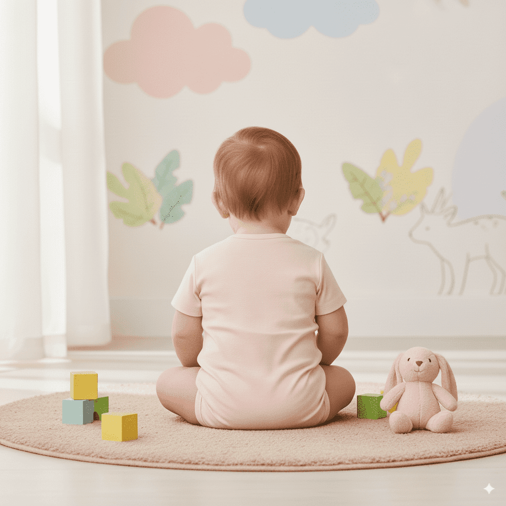 Baby wearing a soft pink onesie with bunny embroidery, styled with a plush rabbit and pastel blocks in a woodland-inspired nursery