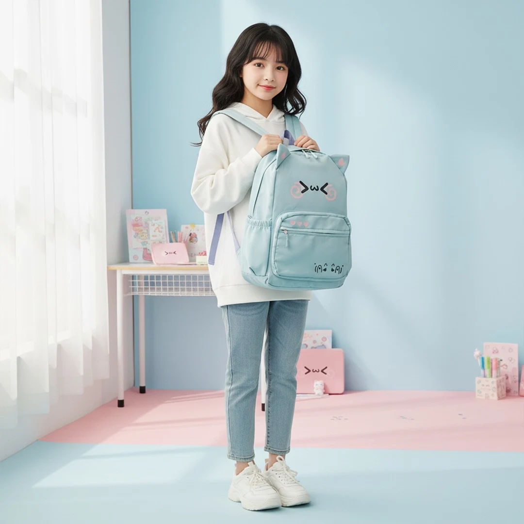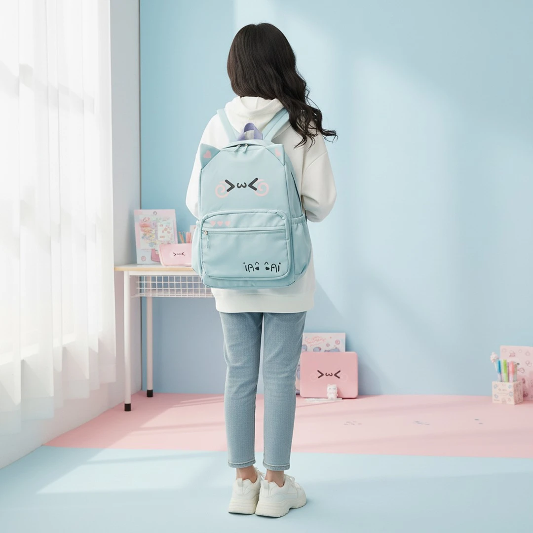 • Features: Adorable cat ears and Kawaii graphics, trendy pastel blue color, spacious design for school/college, multiple pockets for easy organization, and durable material.