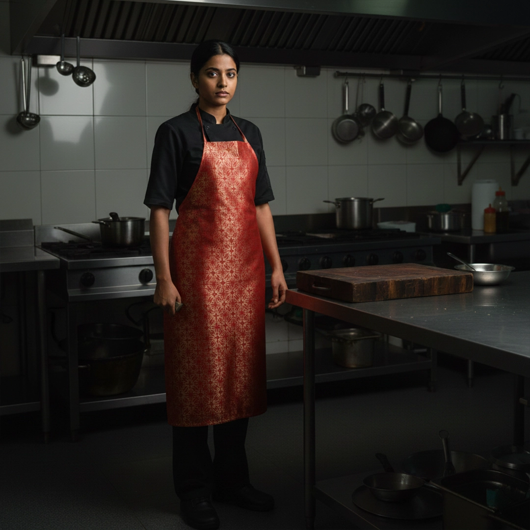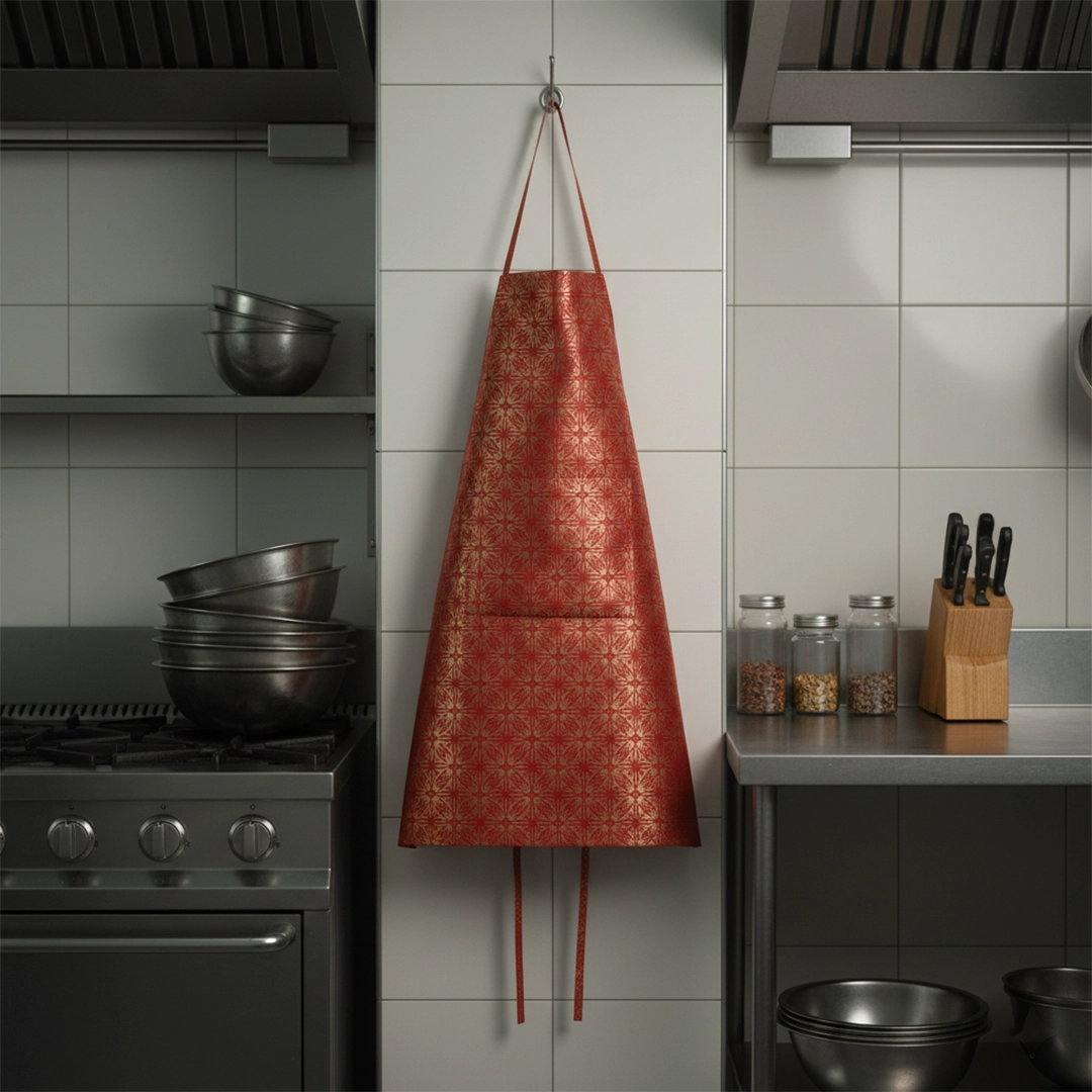 This striking red and gold brocade waterproof apron combines luxury style with heavy-duty protection. Perfect for professional chefs, butchers, and culinary artists who require a durable, easy-to-wipe-clean apron.