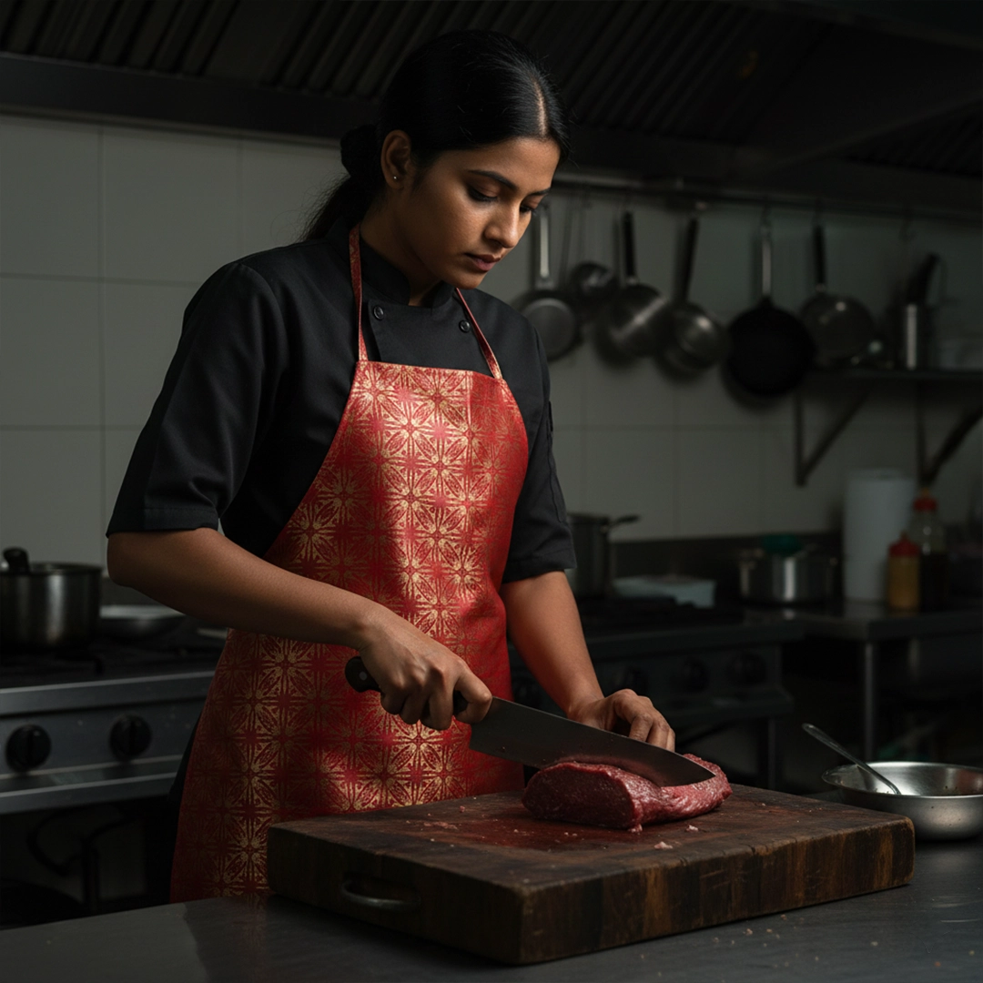 Precision and protection. A professional female chef cuts meat for dinner prep while wearing the durable and stylish red and gold geometric apron.